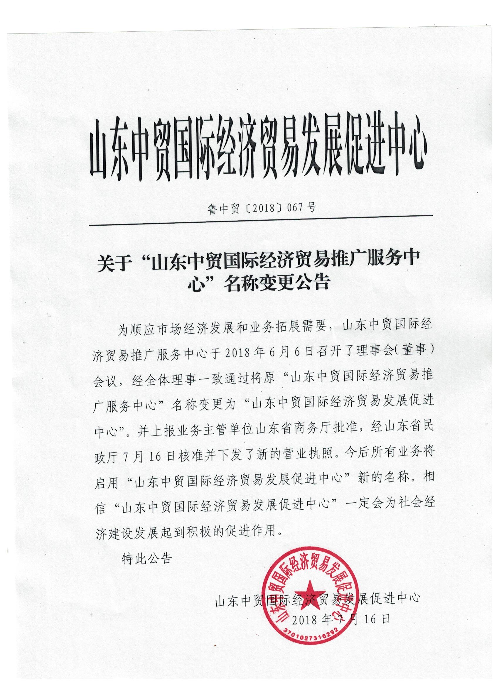 關于“山東中貿國際經濟貿易推廣服務中心”名稱變更公告