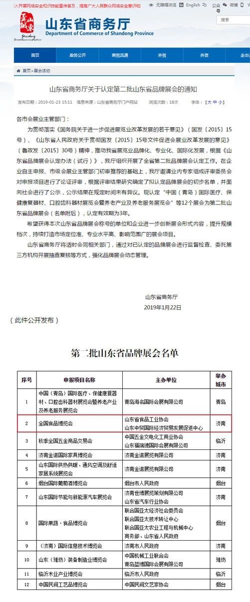 全國食品博覽會榮獲山東省品牌展會的殊榮,不僅是省商務廳對展會走向品牌化權威肯定,也是對近年來全國食品博覽會在會展產業